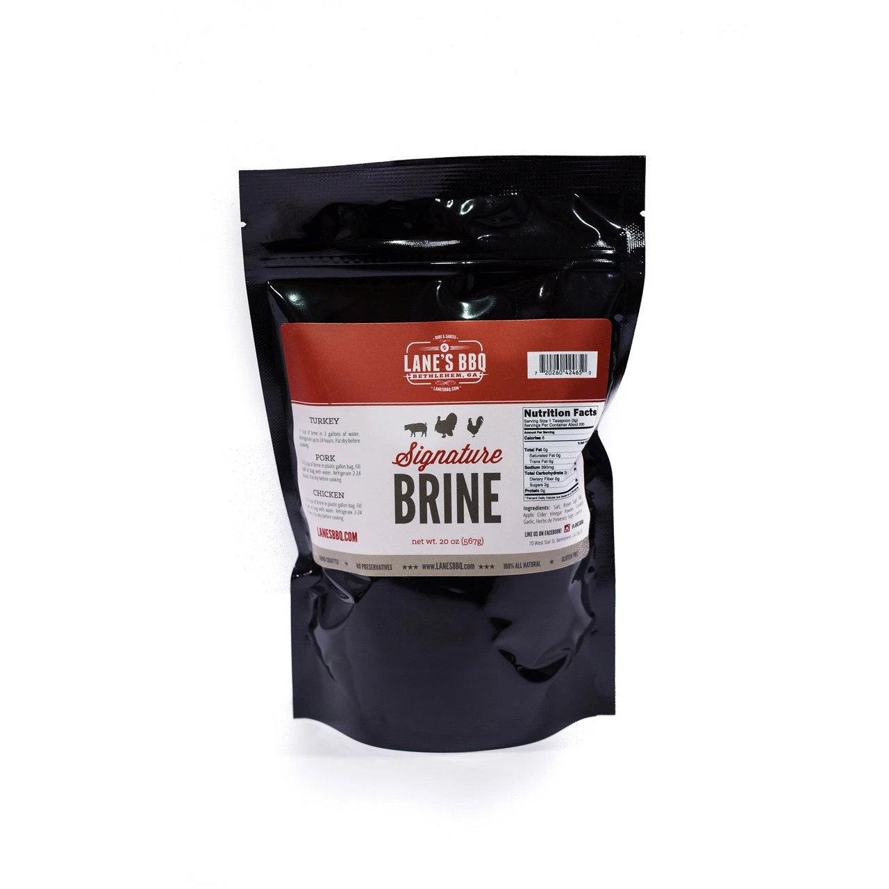 1/2 cup of brine in plastic gallon bag. Fill half of bag with water. Refrigerate for 2-24 hours. Remove from Brine Solution rinse and pat dry. Season with your favorite Lane’s BBQ Rub cook to perfection & enjoy!!