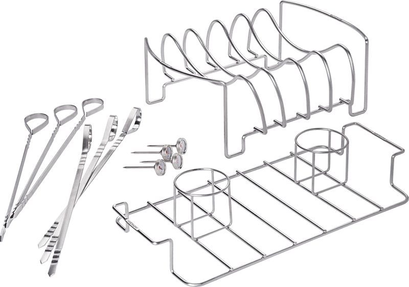 Everything you need to make your own delicious, meaty meals is included in Napoleon’s Meat Lover’s Starter Kit. The Stainless Steel Rib Rack is the perfect way to grill up multiple racks of ribs, or roast some delicious beef. Double your fun with the Stainless Steel Double Beer Can Chicken Roaster. This roaster has two cradles for holding your favorite bubbly beverage in place, while supporting up to two chickens in the perfect position for crispy skin on every side. Build your own kebabs with Six Stainless Steel Skewers. Fill with layers of your favorite marinated meats and veggies for a fun and custom meal that everyone will love. The four, included, Stainless Steel Button Thermometers are perfect for ensuring everyone gets a steak grilled to perfection, that the roast is ready, and the chicken cooked. If you’re a fan of big and beefy barbecues, then our Meat Lover’s Starter Kit is ideal for the perfect backyard party!